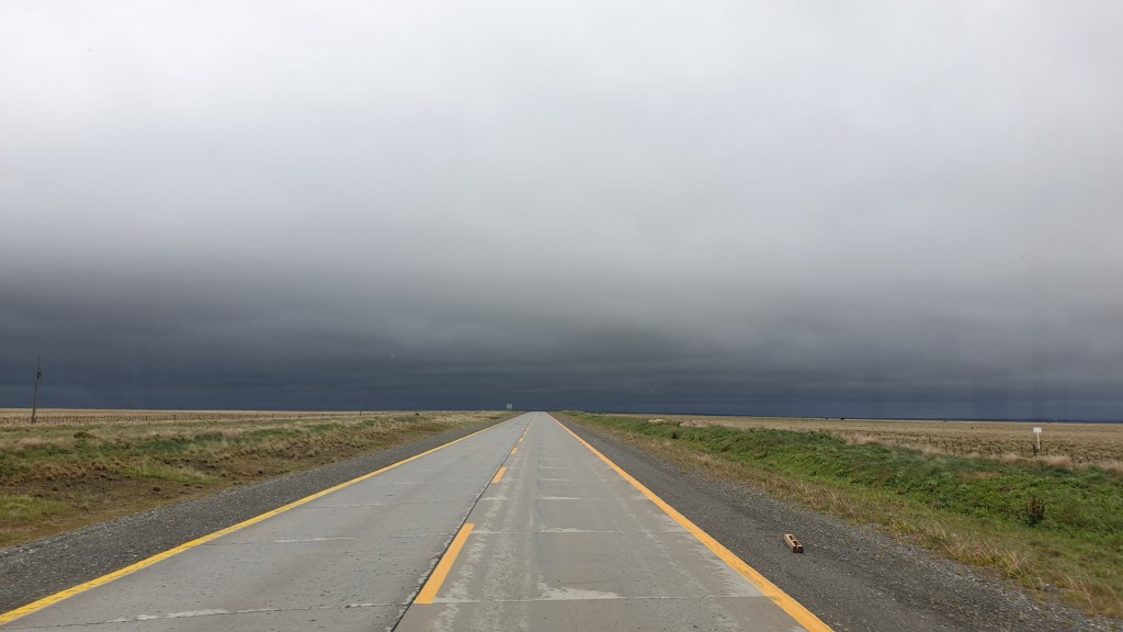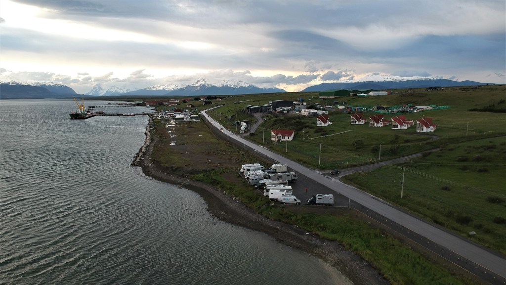 Die Route nach Norden führt wieder durch Grasland, das aber zunehmend üppiger wirkt. Regen ist die Ursache und der begleitet uns auch bis Puerto Natales, der zweiten grösseren Stadt in Chiles Süden. Wir stellen Oski im Zentrum ab, geniessen eine wirklich gute Pizza in der Mesita Grande , bevor wir am Parkplatz zwischen Meer und Ruta 9 eintreffen. Kein ruhiger Platz, aber der einzige, der unseren ganzen Trupp aufnehmen kann…