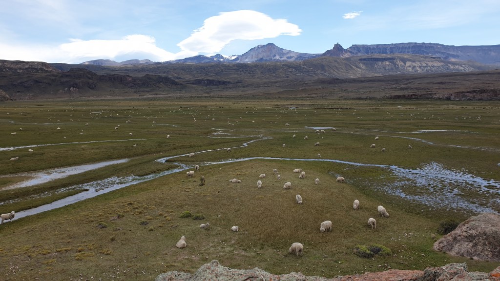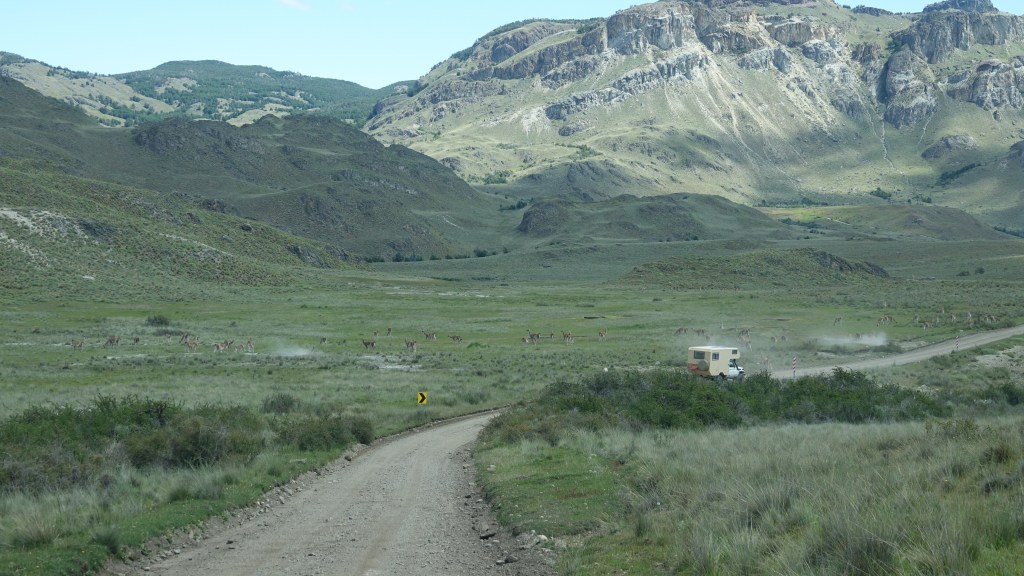 Die Landschaft verändert sich schnell und wird gefühlt zu Kanada oder Alaska. Die Strasse bleibt weitgehend übel. Wir holpern über die Piste und sind begeistert von der traumhaften Gegend die einen enormen Kontrast zum Morgen bildet. Das Valle Chacabuco ist ein privat finanziertes Naturschutzgebiet. Es gibt auch einige Campingplätze, die wir aber links und rechts liegen lassen müssen. Ebenso ganze Herden von Guanakos, Vogelschwärme und weitgehend unberührte Natur. Eine Region, die sicher einige Tage Zeit bräuchte…