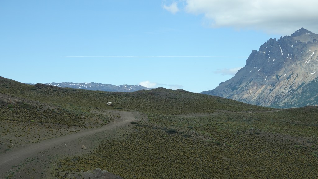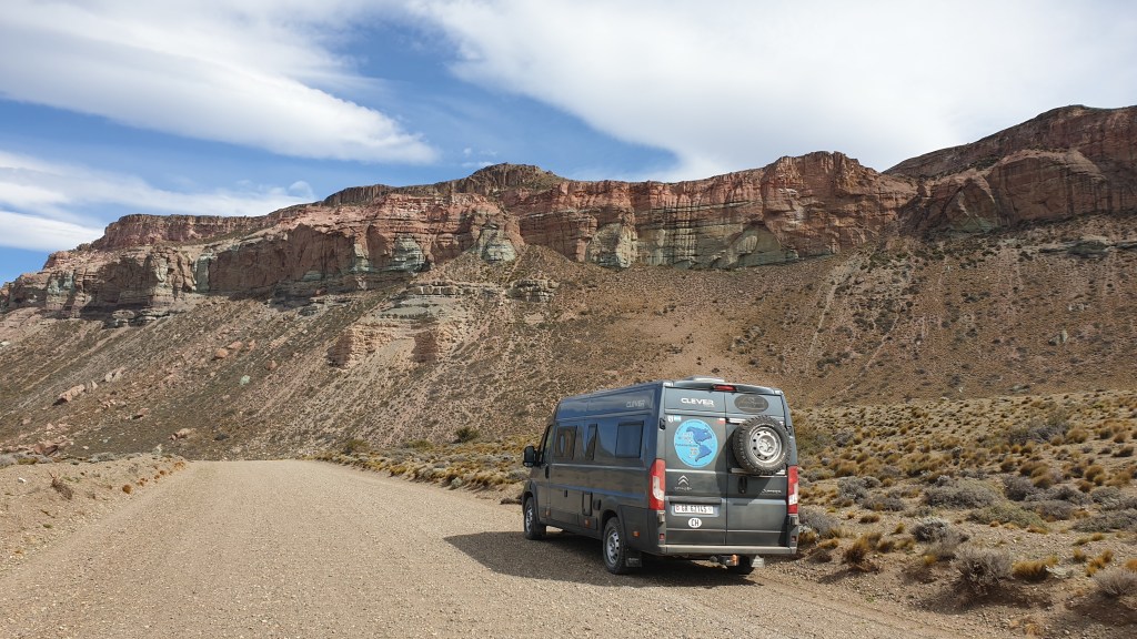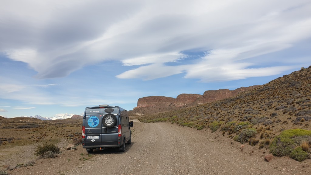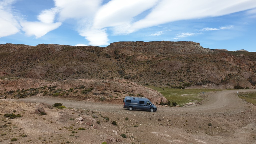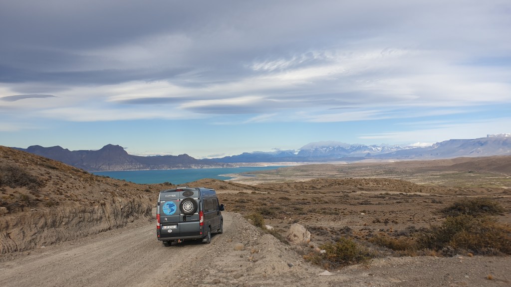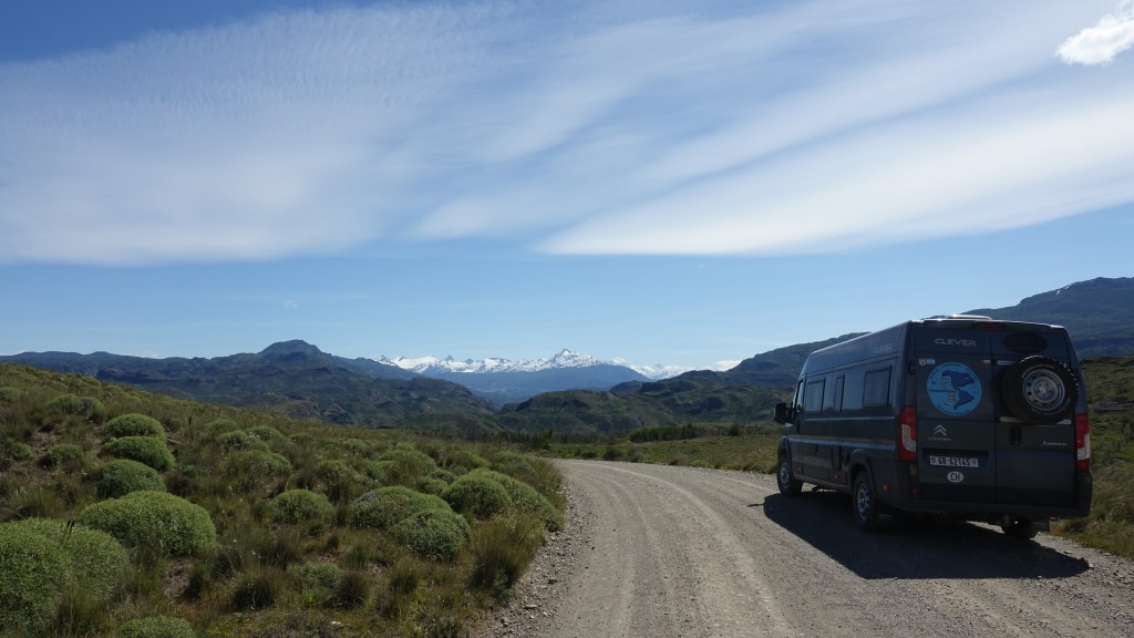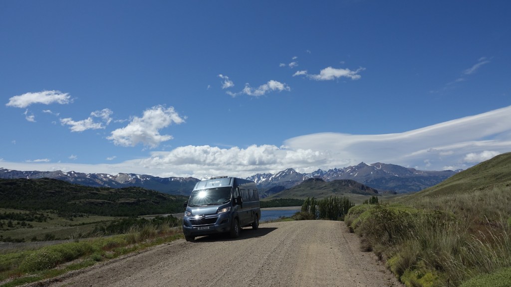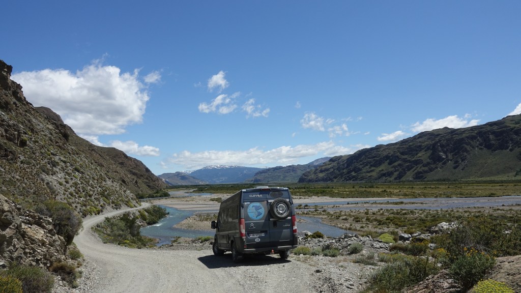07.12.2019: Die Nacht war ruhig bis auf den stetig an Oski zerrenden Wind. Wir sind früh wach, denn die Etappe bis zur Carretera Austral wird sicher anspruchvoll. Der Landcruiser unser Mitfahrer fährt vor uns los. Ich drehe Oski und gerate dabei mit einem Vorderrad in den weichen Kieswulst neben der Strasse. Ein Rad hat keinen Grip, buddelt sich in Sekundenschnelle ein, das andere auf der festen Oberfläche bekommt keine Kraft ab. Ich wünsche mir ein Sperrdifferenzial und muss mit der Klappschaufel Vorlieb nehmen. Etwas Platz für den Auffahrkeil geschaufelt und die Situation ist gemeistert. Dauert trotzdem einige Minuten. Team Toyota hat aber geduldig gewartet.