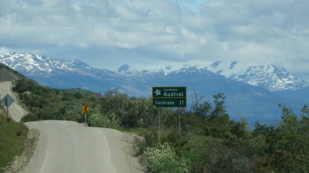 Irgendwann rollen wir dann tatsächlich auf die Carretera zu, blicken auf schneebedeckte Bergriesen und dann ist es soweit: Oski steht auf der Carretera Austral, ein Schild verkündet: Cochrane 17 km, das machen wir. Die Strasse ist bis zum Ort nicht asphaltiert, aber gut befestigt. Tempo 60 fühlt sich an wie Autobahn und so dauert es nur kurz bis wir ins verschlafene Cochrane einrollen. Der Ort ist gefühlt am Ende der Welt, umgeben von Bäumen und Bergen und hat ein gewisses Alaska-Ambiente. Bis auf die typische Avenida, die Prachtsrasse und den Plaza de Armas, den Hauptplatz mit Grünanlage. Wir stellen Oski am Platz ab und laufen in den Supermarkt. Dieser ist ein Sammelsurium aus Baubedarf, Lebensmittelmarkt und sonstigem. Neben dem Betonmischer ist die Fleischtheke, dann folgt schon die Kleiderabteilung. Wir können uns ein Schmunzeln nicht verkneifen. Ja so ist das am Ende der Welt…