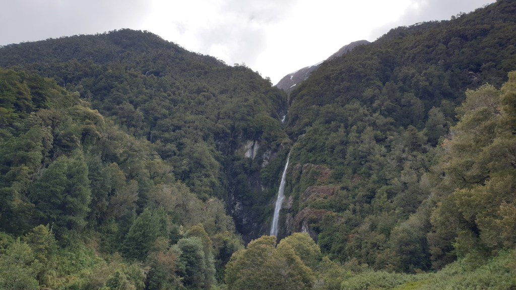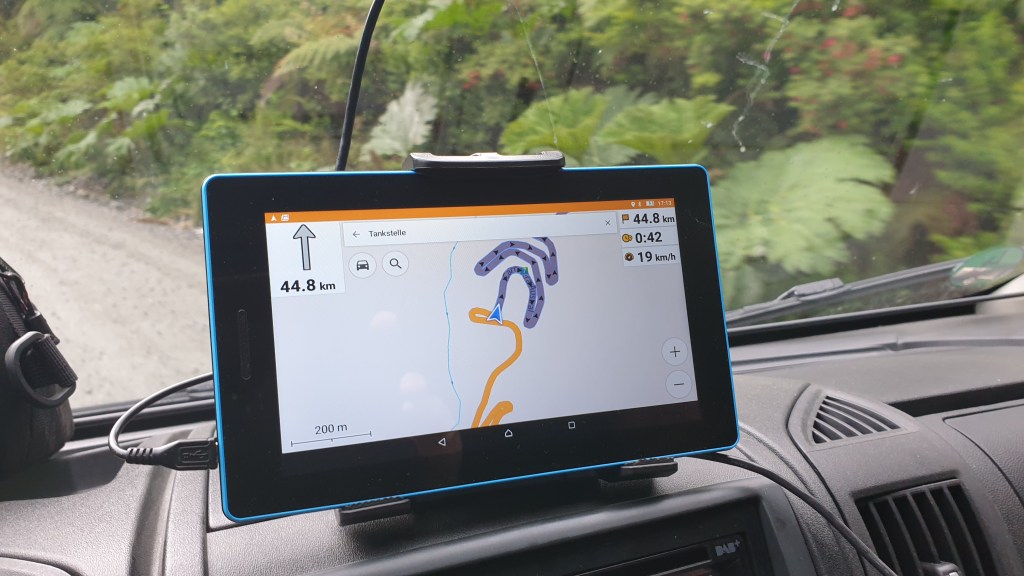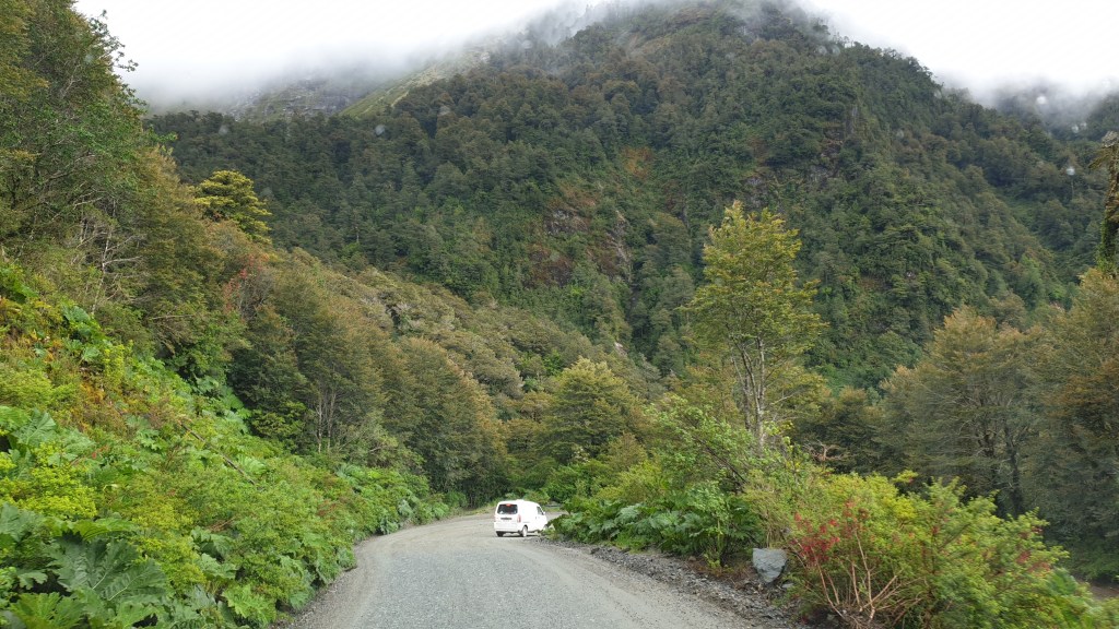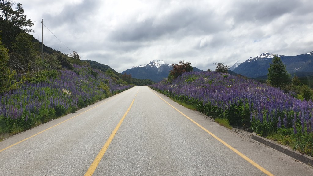 Bei einer Pause kurz vor dem Abzweig nach Osten weckt Alice einen auf der Rückbank seines Gefährts schlafenden Busfahrer. Dieser meint, der Norden der Carretera sei besser ausgebaut. Wir ändern unseren Plan wiederum: Cohaique statt Argentinien und dann weiter nordwärts. Cohaique ist die grösste Stadt an der carretera und recht belebt. Wir machen einen Tankstopp und dann führt die Fahrt weiter. Wir kontaktieren die anderen und machen Puerto Puyuhuapi als Ziel ab. Also über 250 Kilometer, die bei guter Strasse problemlos machbar sein sollten. Lange Zeit ist die Route tatsächlich asphaltiert und wir fahren zügig durch Berglandschaften und Lupinenwiesen bis zu einer Baustelle etwa 60 Kilometer vor den Tagesziel. Hier geht es steil bergauf und Oski hat wieder Schotter unter den Rädern. Wir erklimmen einen Pass auf dessen Nordseite es wirklich abenteuerlich kurvig, steil und übel wieder auf Meereshöhe hinuntergeht. Wir wundern uns noch über einen entgegenkommenden grossen Sattelschlepper der dann den nachfolgenden Verkehr für einige Stunden blockieren sollte.