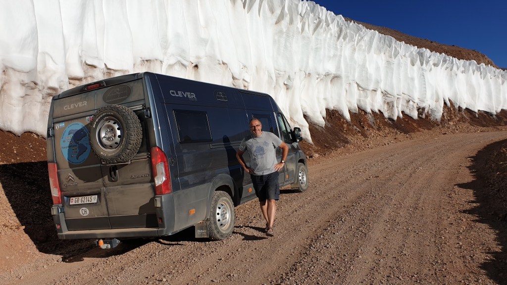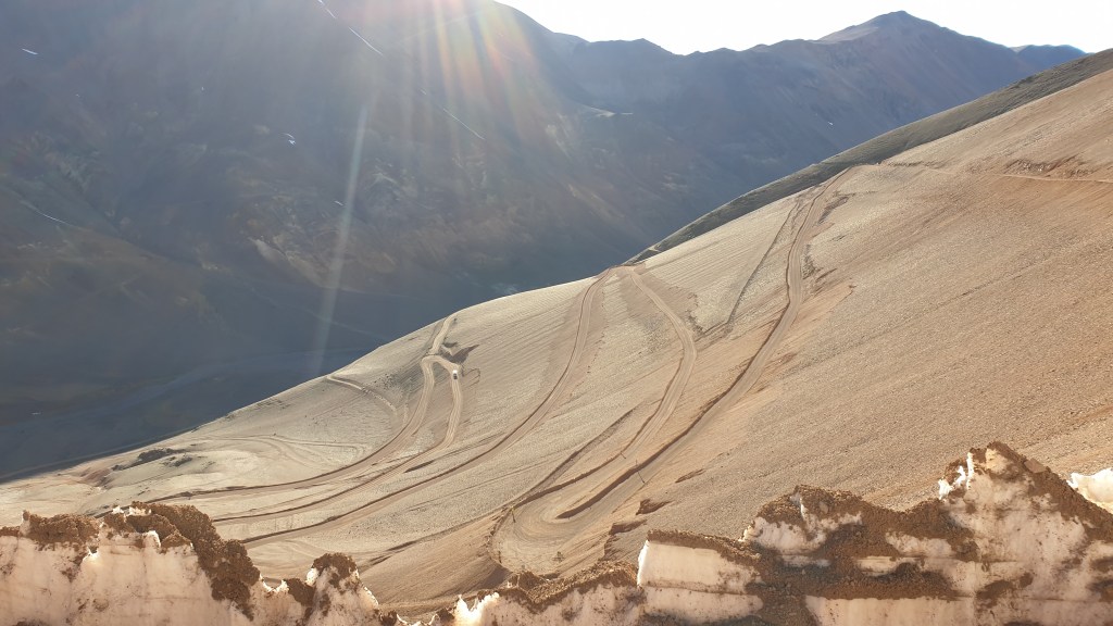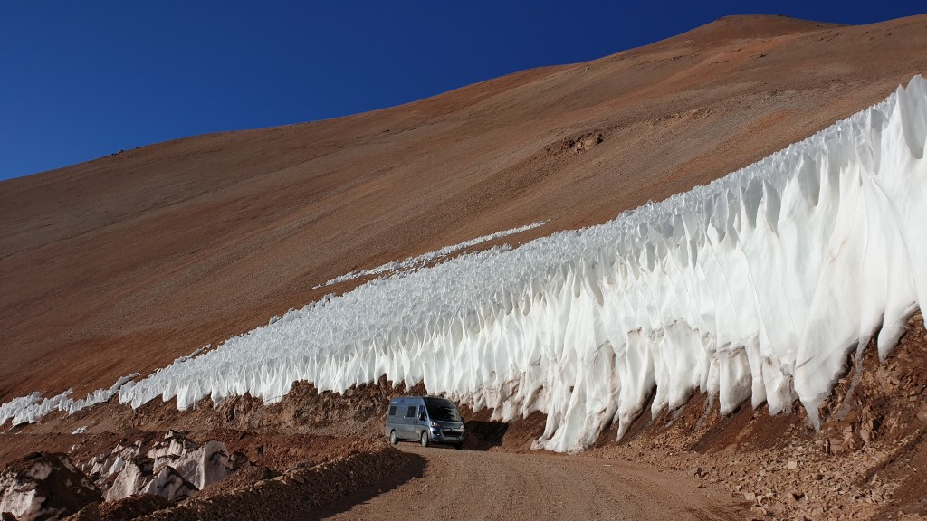 Zuviel versprochen? Natürlich nicht…aber es geht noch weiter. Irgendwann haben wir die 4000, 4100, 4200 und so weiter. Wir passieren ein Tunnelprojekt im Dornröschenschlaf, das wenige Wasser an der Oberfläche ist gefroren, dann kommt auf fast 4500 Metern der Einstieg in den letzten Berghang in einer Kehre. Und eine weitere Showeinlage kommt in Sicht: Büsserschneefelder! Der Schnee des Winters schmilzt unregelmässig ab und hinterlässt das, was ihr in den folgenden Bildern seht: