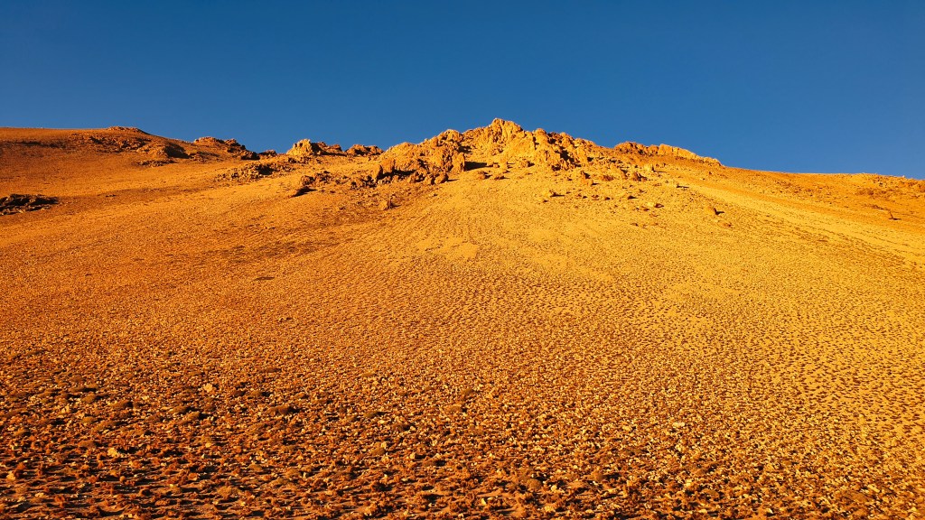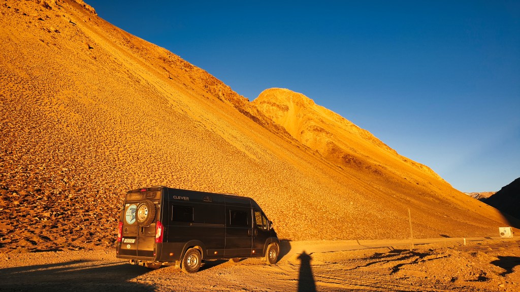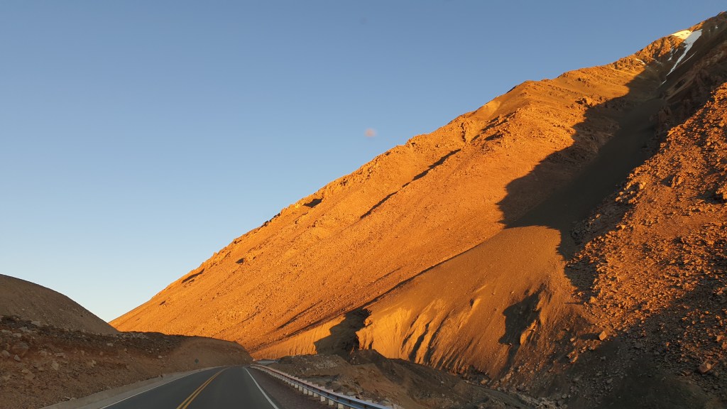 Wir starten früh um kurz nach sechs. Vorteil: Man fährt in den Sonnenaufgang. Die Grenzposten sind noch zu, es gibt keinen Gegenverkehr. Knapp 50 Kilometer sind es zur Passhöhe. Die zuerst noch asphaltierte und gut ausgebaute Strasse wird nach einigen Kilometern zur Schotterpiste. Die rumpelt nicht zu stark, ist recht breit und auch nicht sehr steil. Oski läuft und macht Höhenmeter für Höhenmeter. Schon kurz darauf taucht die Morgensonne die Berge in ein unvergleichliches Licht, das ich so nie vorher oder nachher auch nur ansatzweise erlebt habe, lassen wir hier mal die Bilder sprechen: