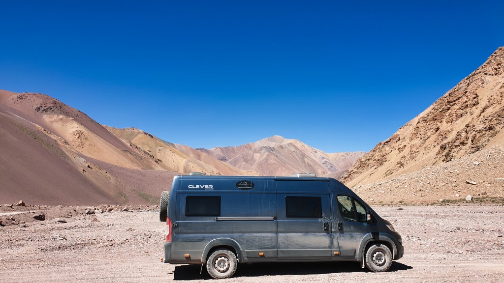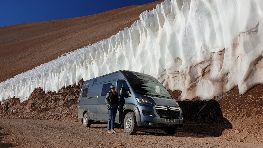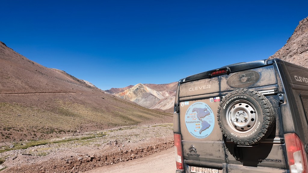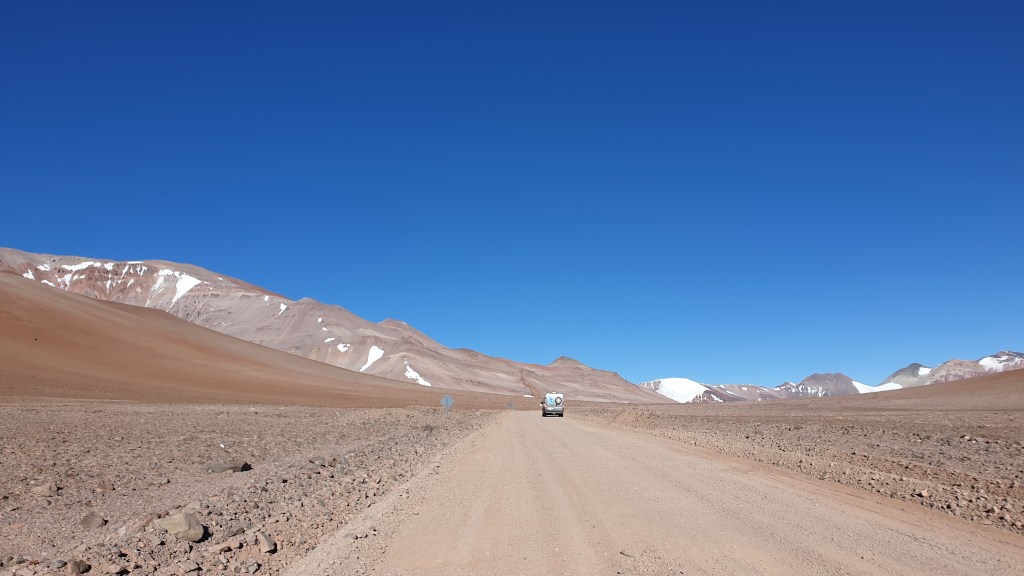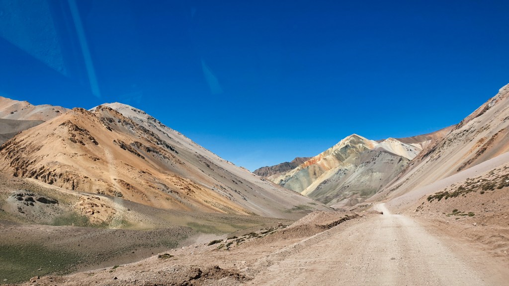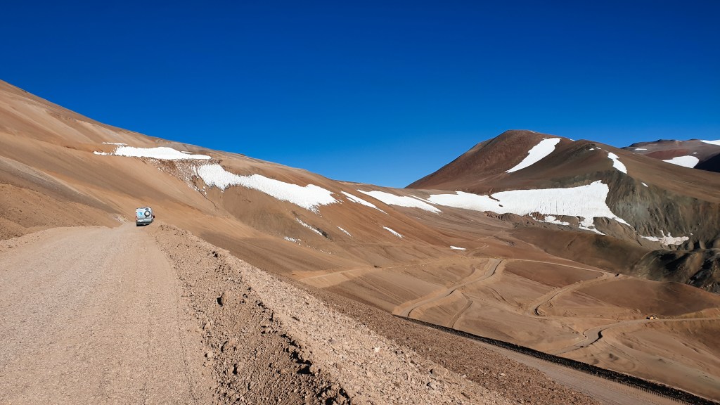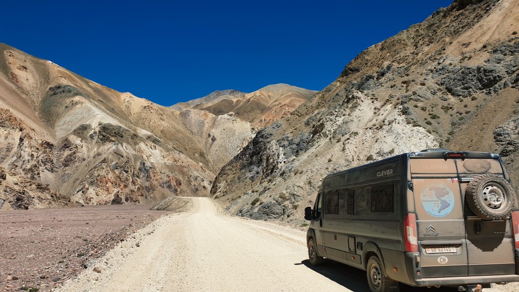 Wie fährt sich das mit einem Zweiliter-Diesel? Ich sage es mal so – zum Glück konnte man auf der Piste eh nicht schneller als Tempo 30 bis 40 fahren… :-))) Der dritte Gang kam erst ganz oben, wo es fast flach wurde, wieder zum Einsatz. Gefühlt bleibt mindestens die Hälfte der PS weg. Aber es geht. So schnaufte Oski anstands- und kraftlos bis zur Passhöhe. Mein Vorhaben, einmal auf 5000 m zu kommen, habe ich schnell vertagt. Dem menschlichen Herz ergeht es ähnlich wie dem Oskiherz. Schuhe binden strengt schon an, leicht bergauf – auf 4800 war ich wohl – geht gerade noch. Man müsste sich deutlich länger akklimatisieren. So gab es einen kurzen Spaziergang durch eine faszinierende Landschaft, einige Versuche im Oski, einen Snack und dann folgte ein weiterer Farbenrausch.