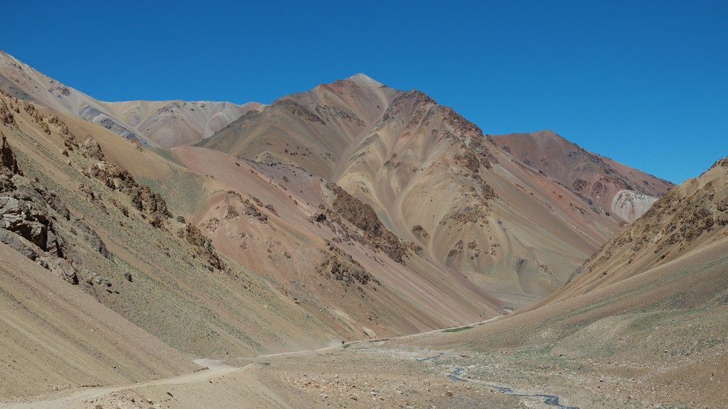 Einige der grösseren Mobile bekommen Atemnot, gehen in Notlauf. Zum Glück haben wir das passende Abschleppfahrzeug dabei. Die Landschaft weitet sich jetzt, schöne Tiefblicke und Aussichten auf die umliegenden Berge, die allesamt deutlich über 5000 m hoch sind. Dazu eine Landschaft, die erst viele Tage später noch in ihrer Kargheit übertroffen wurde.