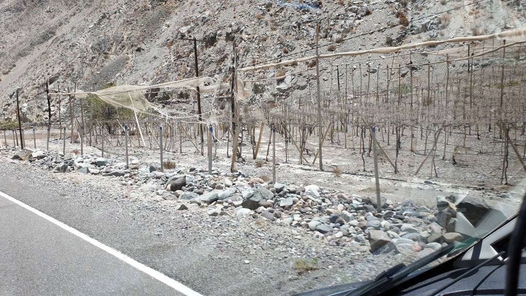 Am Stausee La Laguna wurde die Schotterpiste wieder zu einer guten Asphaltstrasse, die uns zur chilenischen Grenzstation brachte. Hier nahm man es genau, das Auto wurde auch innen begutachtet. Dann führte die Route weiter durch das tiefeingeschnittene Tal des nur an wenigen Stellen Wasser führenden Rio Turbio. Mit Wasser hat auch eine ungute Entwicklung zu tun: Privatisiert man dieses, wird das Nass tatsächlich kostbar und zwar so, dass es sich die Winzer nicht mehr leisten können. Die verdorrten Rebstöcke sind die traurigen Zeugen.