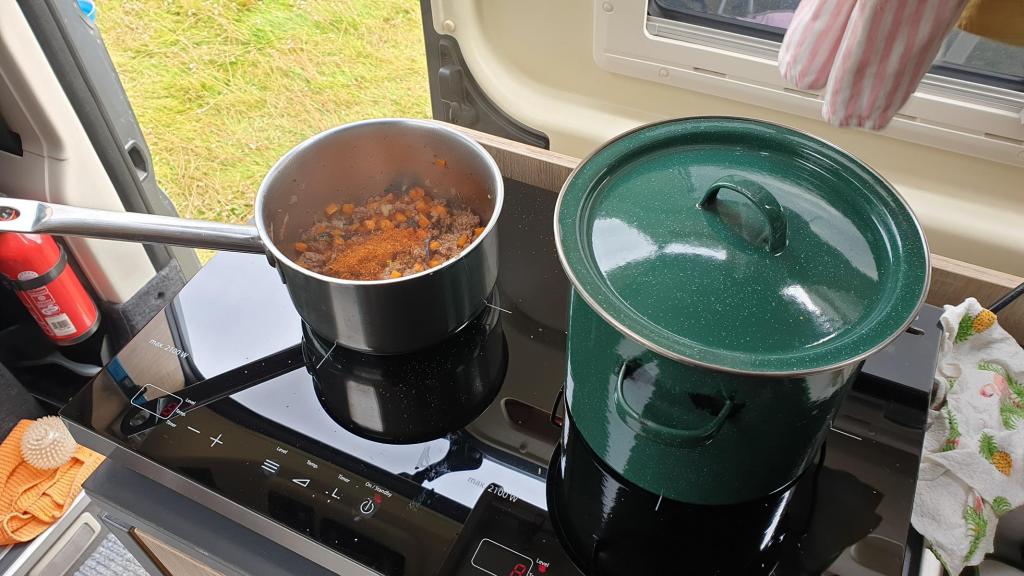 Update 2: Im Frühjahr 2023 wurde der Runner gasfrei. Damit einhergehend erfolgte ein Umbau der Küche. Die Koch-Spülkombination von Dometic wurde entfernt, das Loch in der Arbeitsplatte mit einer 6 mm Kunstharz-Vollkernplatte verschlossen. Darin findet ein neues, etwas grösseres Spülbecken Platz und ein mobiles Induktionskochfeld mit zwei Feldern auf der neu entstandenen Arbeitsfläche. Die Stromversorgung der Induktion erfolgt durch eine Powerstation EcoFlow Delta 2 MAX.