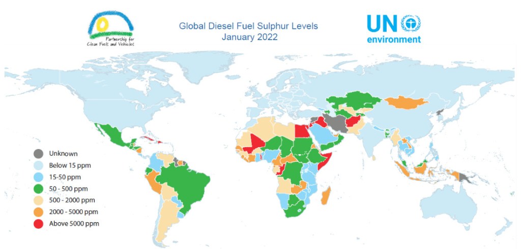 Als erster Punkt sei die Qualität des Diesels genannt. Ein hoher Schwefelgehalt verursacht eine schnellere Verstopfung des DPF. Die UNEP veröffentlich von Zeit zu Zeit Karten, in welchem Land mit welchem Schwefelgehalt zu rechnen ist. Letztes Update 2022.