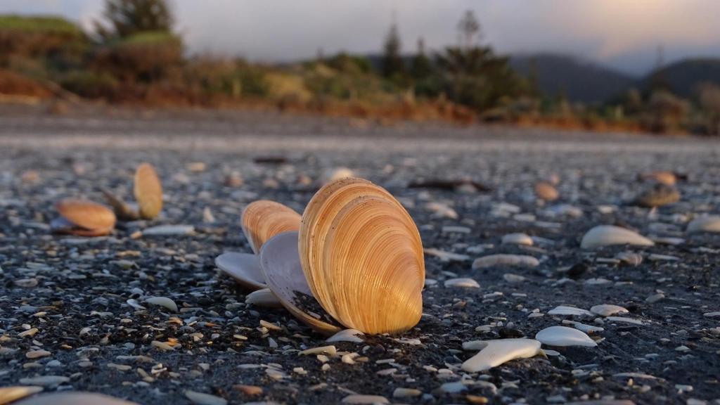Paekakariki Beach – hier gibt es wohl Millionen leerer Muschelschalen und schwimmende (Bims-) Steine, die sich ganz eigentümlich an einer Flussmündung anhäufen. Muschel im Sonnenuntergang. Ich finde, das Bild hat was…