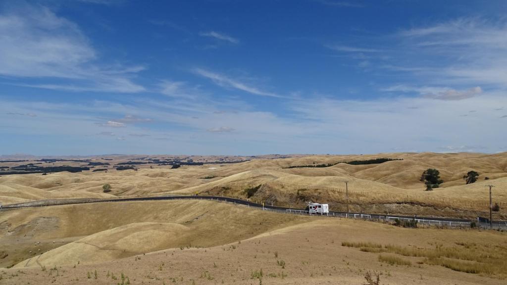 Östlich der Ruahine Range: Eindrucksvoll – zumindest während unserer Anwesenheit – waren die klimatischen Gegensätze zwischen West und Ost. Auf dem Weg nach Napier an der Südostküste hatte man fast den Eindruck einer Wüste. Das Grasland war komplett verdorrt, es war heiss und nichts erinnerte an den saftig grünen Westen einige Stunden früher am gleichen Tag. Sehr spannend…