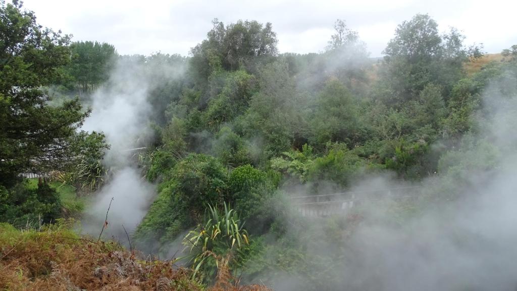 Noch spannender war das Waikite Valley. Hier kommt das Quellwasser des kleinen Baches kochend aus der Erde. Etwas unterhalb der Quelle zapft man den Bach an, kühlt das Wasser auf einer grossen Fläche ab und leitet es mit ca. 40°C in einige Becken. Fertig ist das Thermalbad. Und es hat wirklich gut getan!