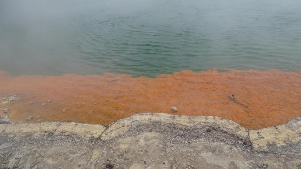 Champagne Pool in Wai-O-Tapu: Ja der ist nicht nur wegen seines Farbenspiels sehr interressant. 65 Meter Durchmesser aber 250 Meter tief und stets leicht prickelnd. Eben Champagner…aber geruchtstechnisch wegen der Schwefedämpfe gar nicht von der feinen Art.