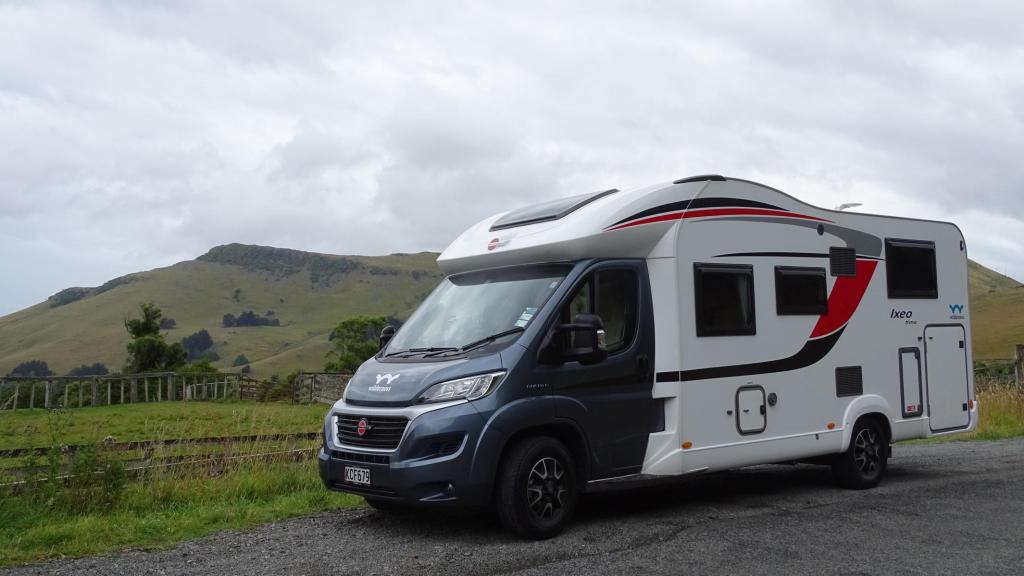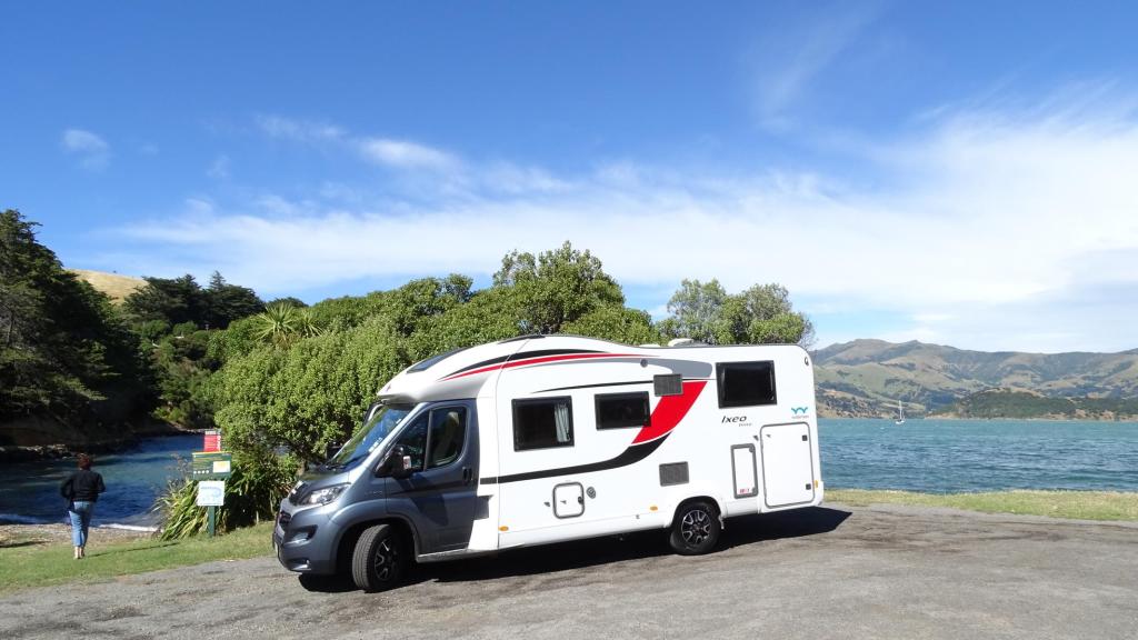 Am nächsten Abend flogen wir dann nach Christchurch auf der Südinsel. Nach einem Akklimatisationstag – wegen 12 Stunden Zeitverschiebung – konnten wir dann am vierten Reisetag ins Mobil einziehen. Das Fahrzeug war ein Teilintegrierter von Bürstner auf Fiat-Basis – bis auf die Rechtslenkung also nichts ungewöhnliches. Ungewöhnlich für neusseeländische Verhältnisse war der nicht spiegelverkehrte Innenausbau – mit der Folge, dass man durch die Aufbautür zur Strasse hin aussteigen musste und an der Tür durch einen Warnhinweis daran erinnert wurde.