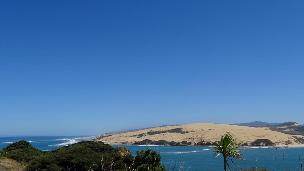 Dünen bei Omapere: In der grünen Landschaft der Westküste von Neuseelands Nordinsel ist der riesige Sandhaufen am anderen Ufer der Bucht ein echter Fremdkörper – und für den Tourfotografen ein lohnendes Motiv.
