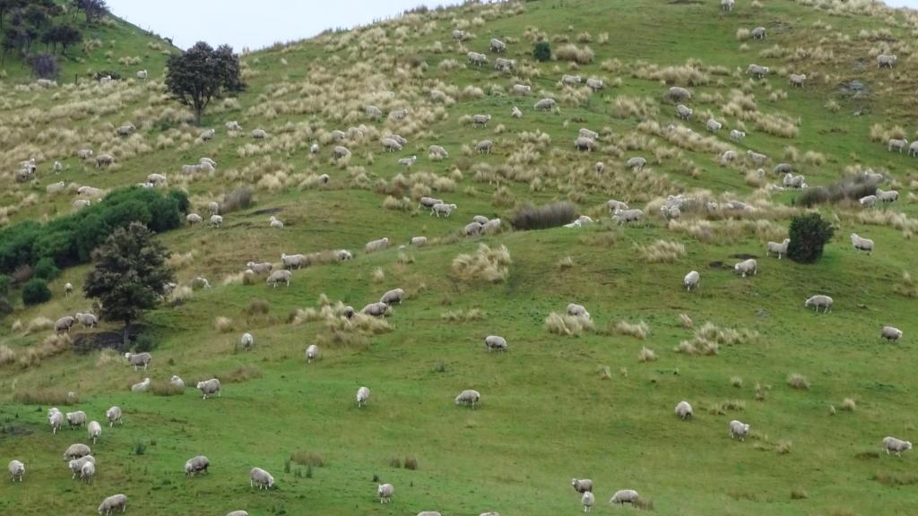 40 Millionen Schafe – Ja die Schafe sind insbesondere im Hügelland der Südinsel allgegenwärtig. Erst in der Auswertung der Fotos war zu erkennen, was ich beim Schuss aus dem fahrenden Mobil nicht sah: Neben den Schafen sind auch noch gleichfarbige Büsche auf der Weide, ok…