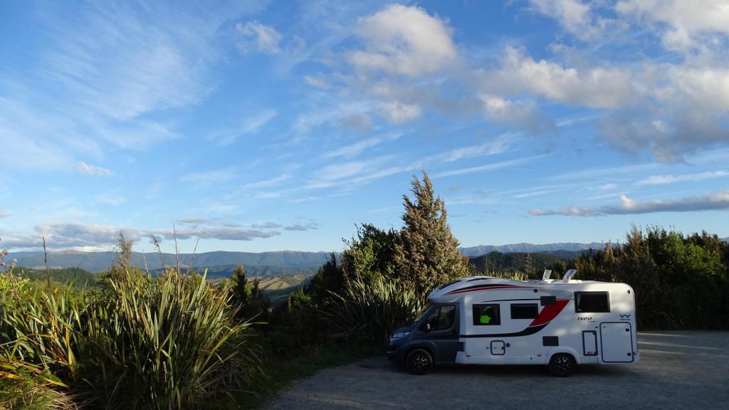 Freistehen auf dem Lookout: Eigentlich ist es nur ein Parkplatz im Nirgendwo. Einige Picknicktische und -Bänke, ein Plumpsklo, ein Aussichtspunkt in der Nähe mit einer wunderbaren Sicht auf das umliegende Hügelland. So lässt es sich prima gratis übernachten!